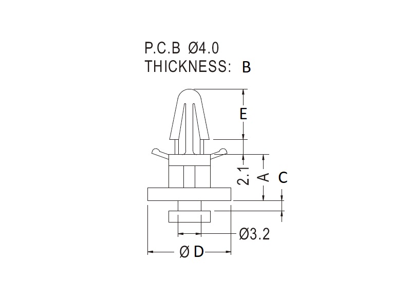 | Part no. | Material | Color | A Length | B Panel THK | C Chassis THK | D Shoulder dia. | E Protrusion | Package |