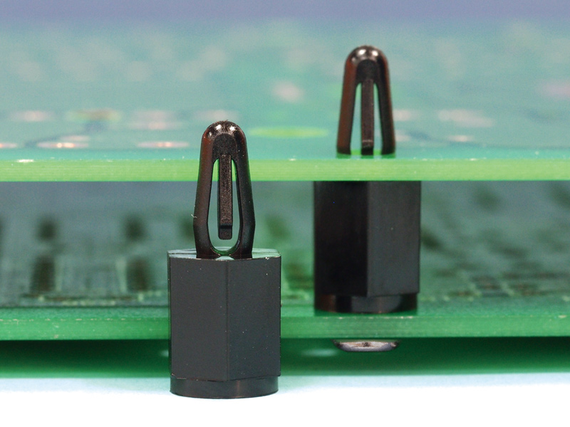 Female M3 hexagonal threaded snap lock PCB support. Bayonet top fits 4 mm panel hole. Standoff height is 8 mm.