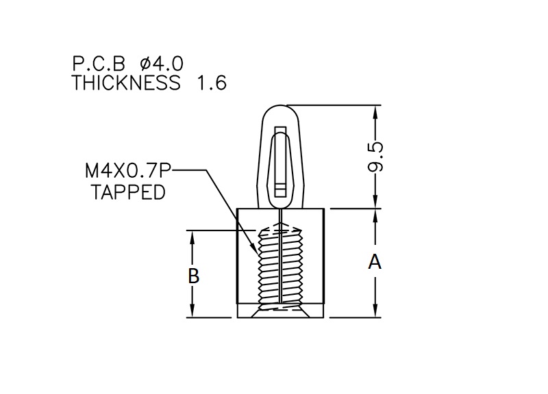 Female M3 hexagonal threaded snap lock PCB support. Bayonet top fits 4 mm panel hole. Spacer length is 8 mm.