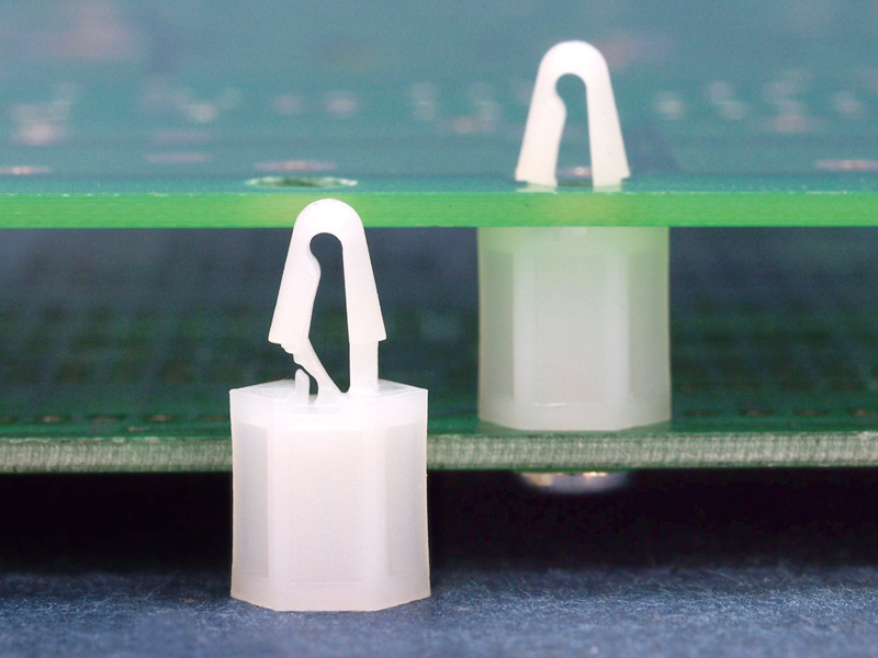 Snap lock hexagonal self tapping spacer with a pilot hole of 2.95 mm and a removable snap lock for a 4 mm mounting hole. Standoff height is 9.5 mm.