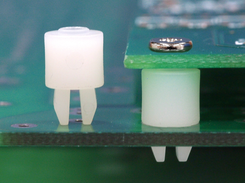 This spacer nut fits into a squared panel hole of 4.5 x 4.5 mm and expands when a self-tapping crew of 2.9 mm is installed. Standoff height is 8 mm.