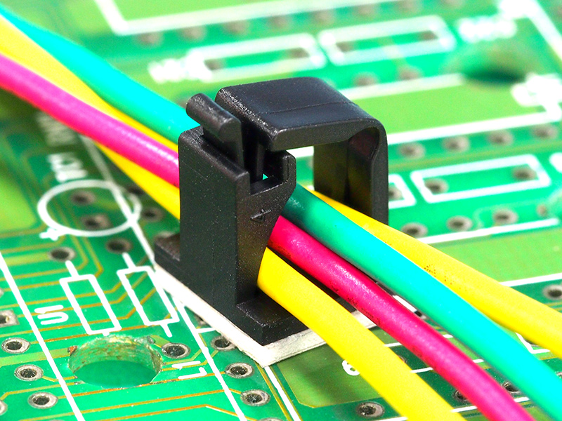 Adhesive Flat Cable Clamp (WxH) 9.5×7.44mm Hinge Locking.Internal Width 6.5mm. Nylon 66. Color Natural or Black