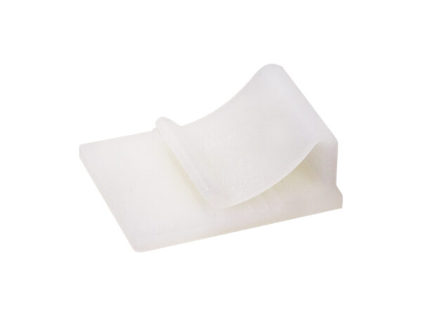 Adhesive Flat Ribbon Cable Clip. Base 25.8x15mm. Height 9.5mm Nylon 66. Available in Natural and Black. Spring loaded with serrated edge to hold cable firmly in position. With Pull Tab for easy removal of the adhesive backing