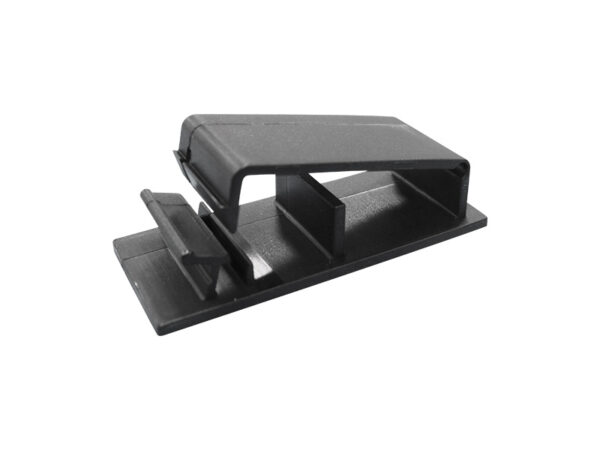Flat Cable Clamp 2 Cells Hinged Locking Self Adhesive. Nylon 66. Available in Natural or Black. The vertical wall guides wires in to seperate lanes