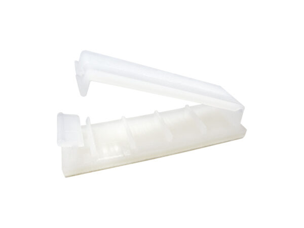 Flat Cable Clamp 4 Cells Hinged Locking Self Adhesive. Nylon 66. Available in Natural or Black. The vertical wall guides wires in to seperate lanes