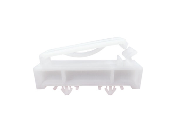 Dual Ø4.0mm hole size Snap-Lock Elevated Hinged Flat Cable Clamp (WxH) 43.5×5.0mm with Retention. Max. Cable Width 30.0mm. Snap-Lock Centerline Pitch 20.0mm. Chassis Thickness 0.8-2.0mm. Nylon 66. Available in Natural or Black.