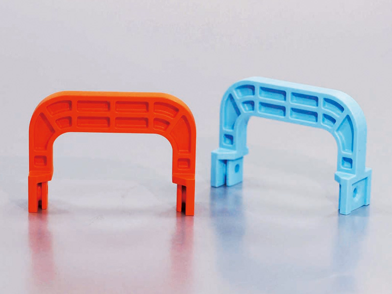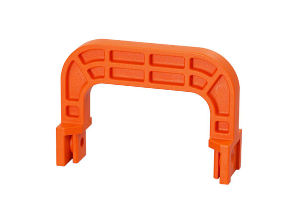 Screw Mount Bridge Handle Polycarbonate + ABS. Centerline 43.5mm. Color Blue/Orange. This Equipment Handle features simple through bores designed for front-mounted installation.