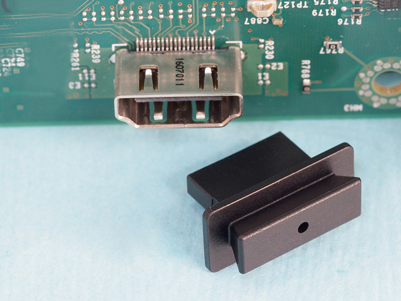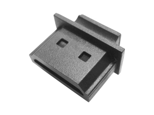 HDMI A Female Port Dust Cover with Pull Tab. Material Polyethylene. Color Black. Designed to fit securely, preventing dust and dirt from entering the port