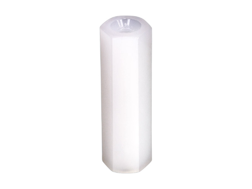 Tapped hex Nylon 66 spacer, female/female, UNC 4-40 threads on both ends with 6.4 mm thread depth per end. Standoff height is 28.6mm.