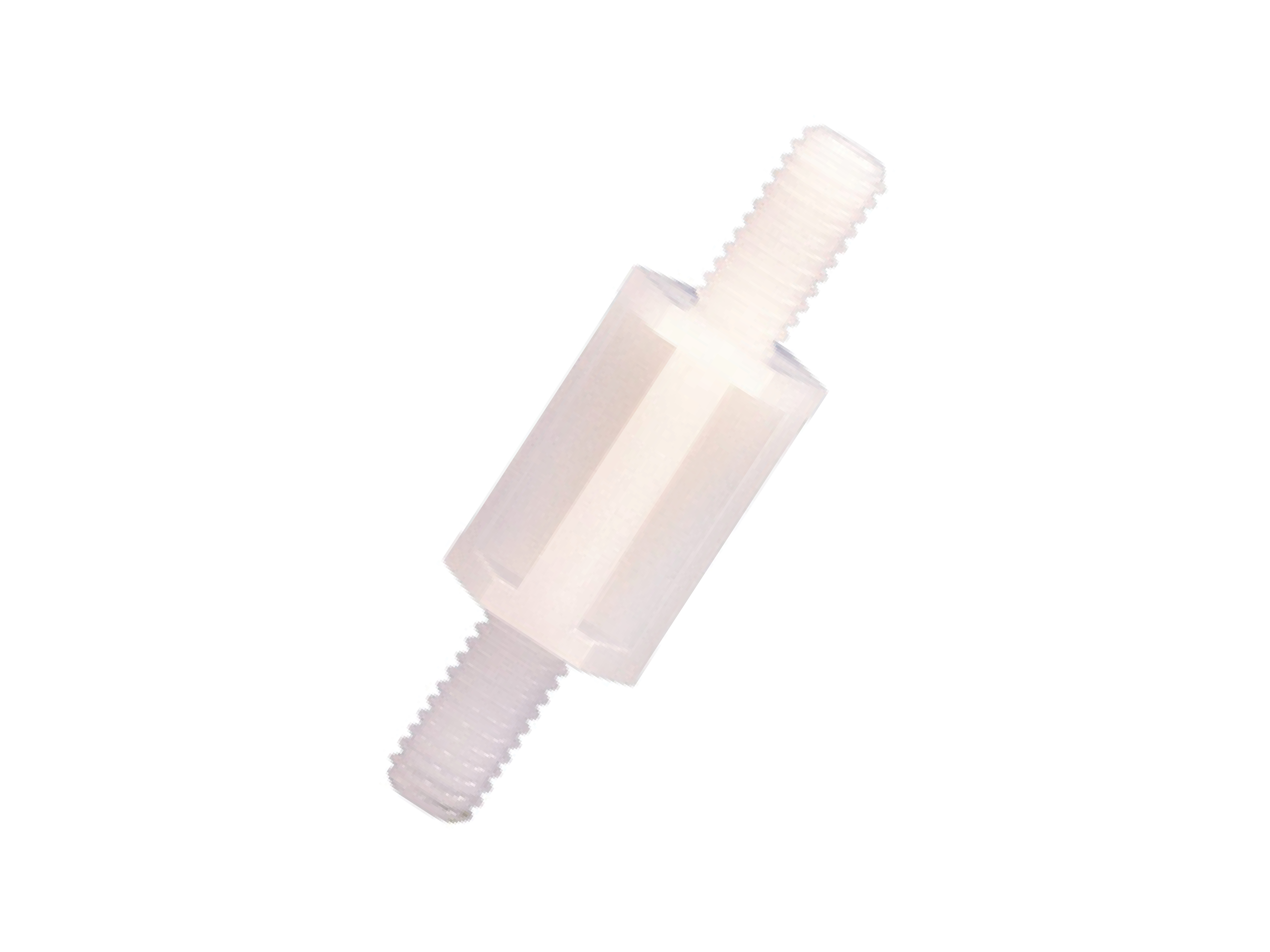 Metric tapped hex Nylon 66 spacer, male/male with a M4 metric external 6mm thread on both ends. Standoff height is 19,0mm