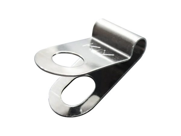 Stainless Steel Grounding P-Clip. Cable Holding dia. Ø4.0mm. Clip Width 8.6mm. These clips feature a unique P-shaped design with a Ø4.5mm Screw Mount hole, allowing for easy installation and secure attachment.