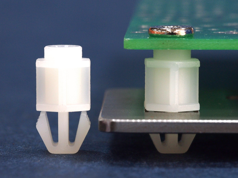 Snap lock M3 spacer with arrowhead for a mounting hole of 5.5 x 7.1 mm. Standoff height is 22 mm.