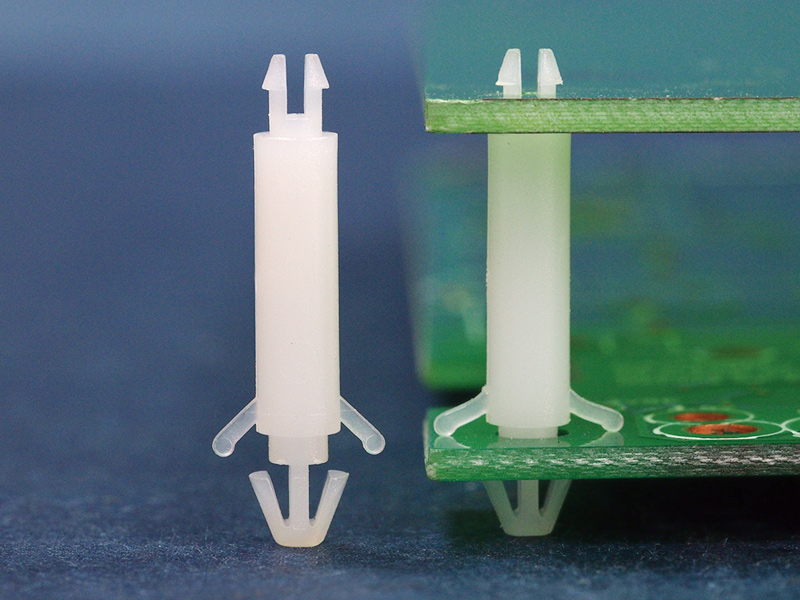 Dual locking support post. Two prong top hole fix for 2.5 mm and bottom hole arrowhead fix with tension wing for 3 mm. Standoff height is 14 mm.
