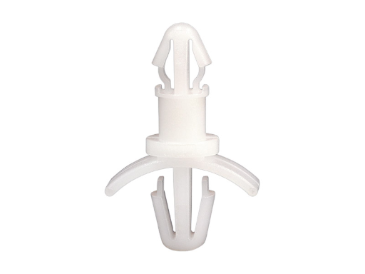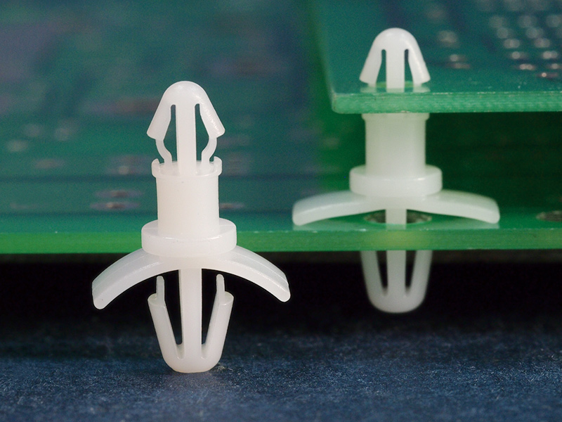 Dual locking support post. Arrowhead top for 4 mm panel hole and arrowhead with tension wing for 4.8 mm chassis hole. Standoff height is 7.9 mm.