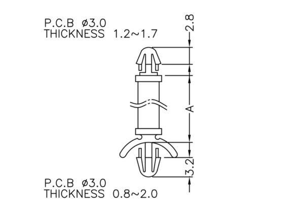 Dual locking support post. Arrowhead top for 3 mm panel hole and arrowhead with tension wing for 3 mm chassis hole. Spacer length is 4.8 mm.