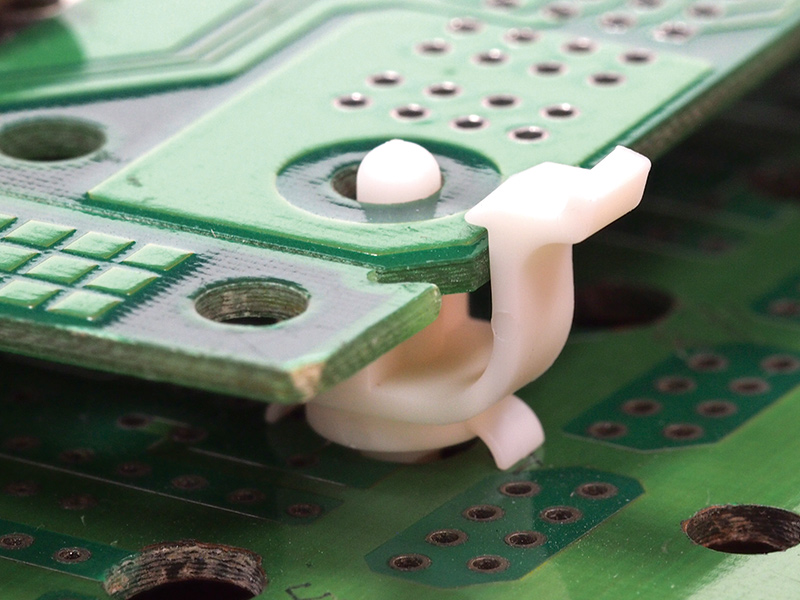 Spacer Edge Hold Nose Snap Lock. Nylon 66. Color Natural/Black. Chassis Hole dia. Ø4.8mm. Thickness 1.8-2.2mm. Top Hole dia. Ø3.2mm. Thickness 1.6mm. Spacer Length 8.0mm