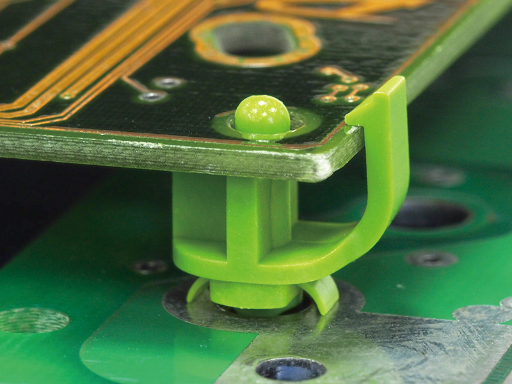 Spacer Edge Flat Rest Snap Fit arrowhead with tension wings. Nylon 66. Color Natural/Black. Snap Fit hole dia. Ø4.8mm. Top hole 3.2mm. Thickness 1.8-2.2mm. Spacer Length 8.0mm