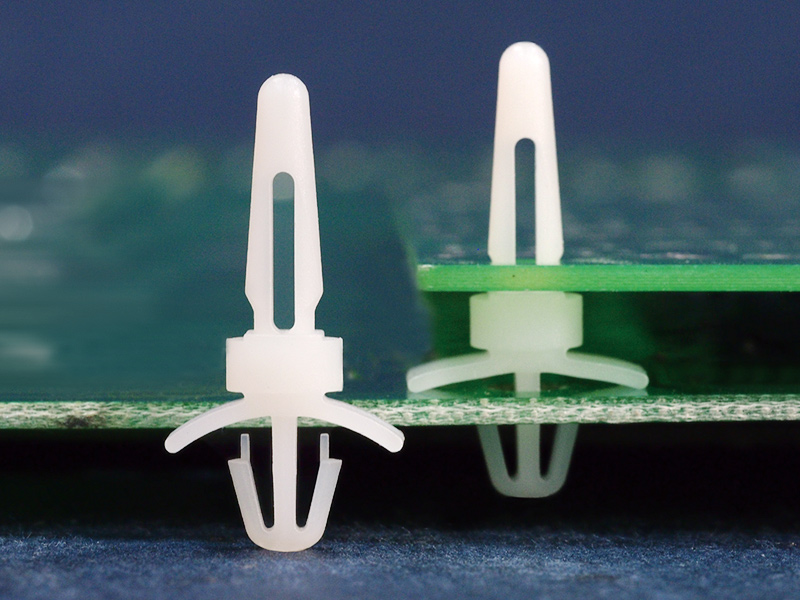 Dual locking support post. Snap lock for top hole of 4 mm and arrowhead with tension wing for 4.8 mm chassis hole. Spacer length is 4.8 mm.