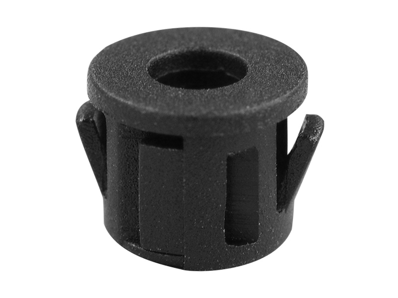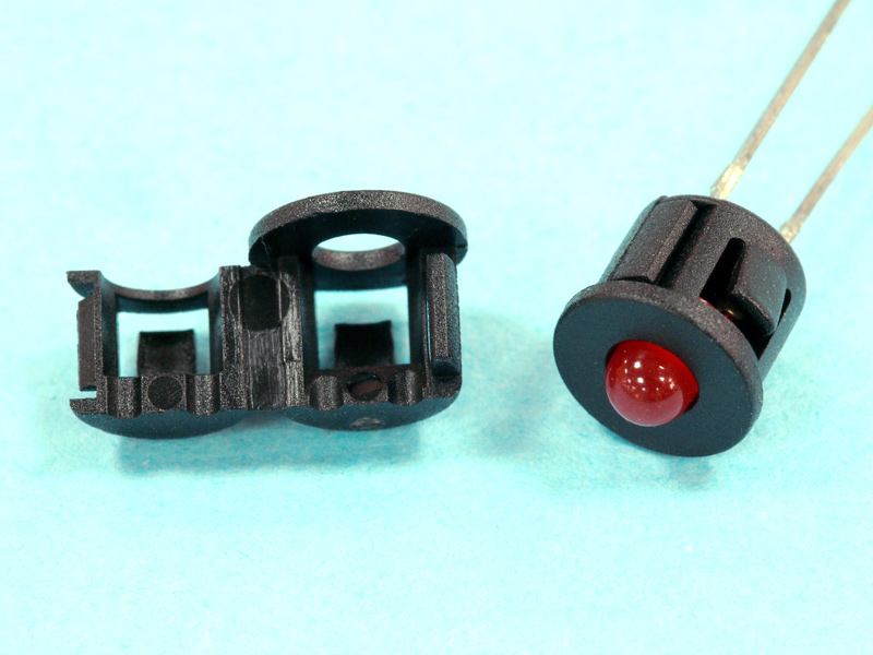 LED Snap-Fit Panel Mount housing for 3mm (T-1) LED. Panel hole size Ø6.35-6.4mm. Panel Thickness 0.8mm. Material Nylon 66. Color Black. Assembly friendly!