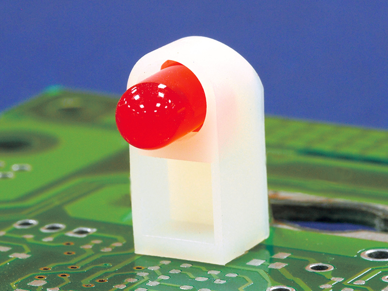 LED Holder PA66 Right Angle PCB Mount for 3 lead LED size 5mm(T-1¾) with 2 Centerpins. Centerline 12.0mm. The 2 Centerpins avoid the holder from turning and relieves the stress on the leads of the LED. LED’s shown for Demo, not included in holder
