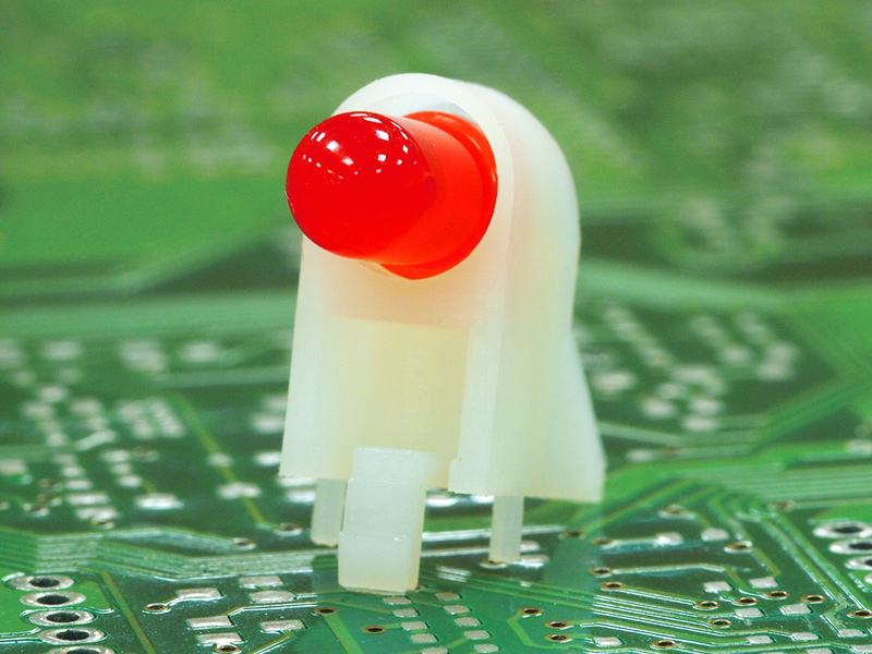 LED Holder PA66 Right Angle PCB Mount for 3 lead LED size 5mm(T-1¾) with Locking & 2 Centerpins. Centerline 13.5mm. The Locking & Centerpins avoid the holder from turning and relieves the stress on the leads of the LED. LED’s shown for Demo, not included in holder