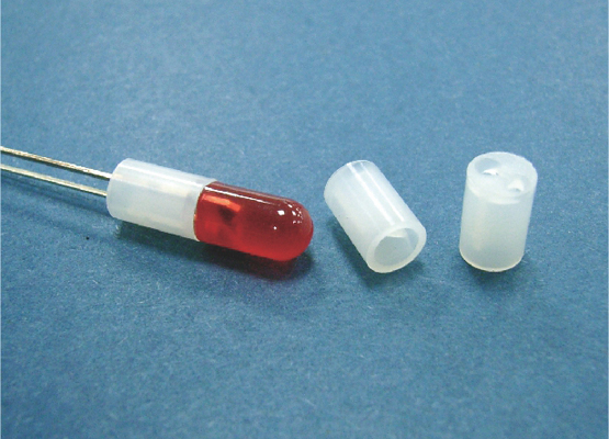 Bi-Lead LED Spacer Mount for LED size 5mm (T-1¾) with a self-aligning feature to keep the leads separated. Length 2.0mm. Nylon 66. Available in Natural and Black