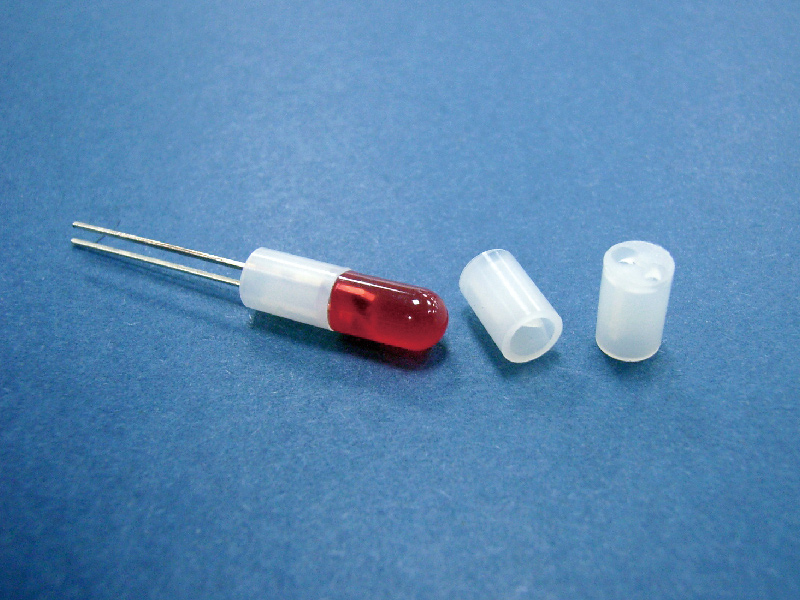 Bi-Lead LED Spacer Mount for LED size 5mm (T-1¾) with a self-aligning feature to keep the leads separated. Length 5.0mm. Nylon 66. Available in Natural and Black