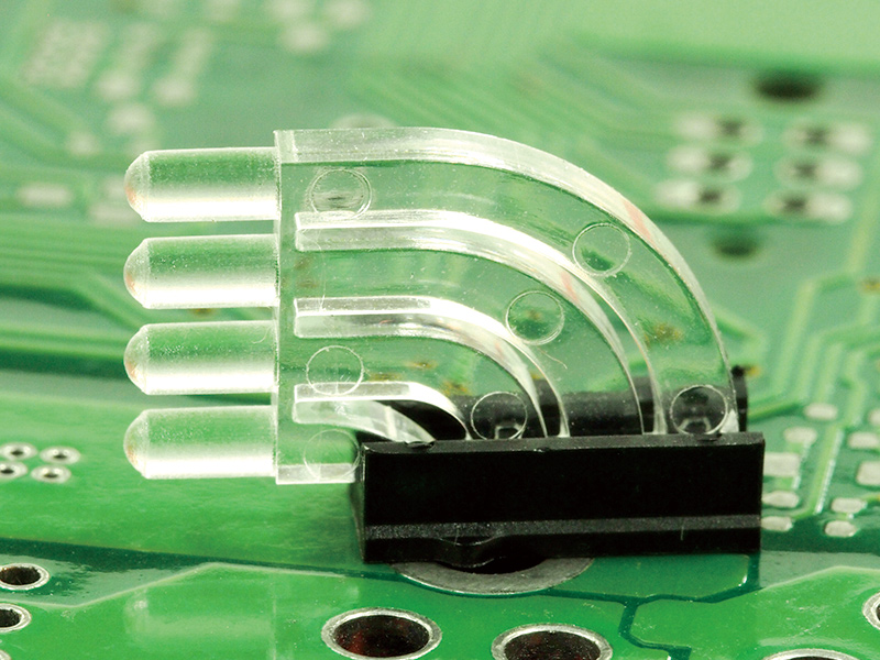 Right Angled 90° 4-Level PCB Press Fit single station Light Pipe Assenbly for SMD Led’s. Material Polycarbonate. Domed Lens dia. Ø1.8mm. Assembly consists of Nylon Mask Holder (Part# LPH-3-1) and Light Pipe (Part# LP-3)