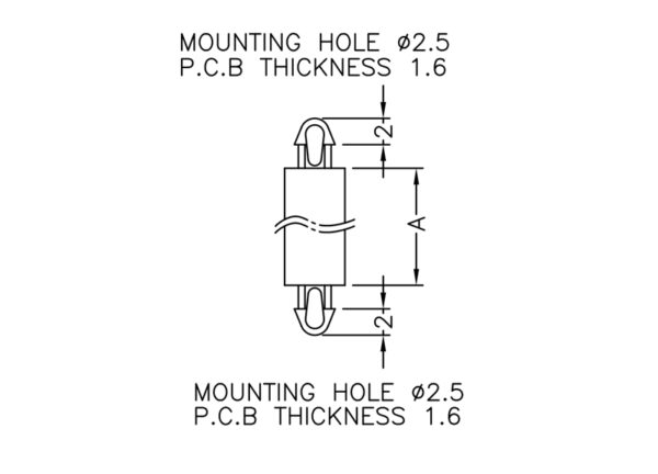 Dual locking support post. Snap lock teardrop design allows fixation into small holes. Top and bottom hole 2.5 mm. Spacer length 16 mm.