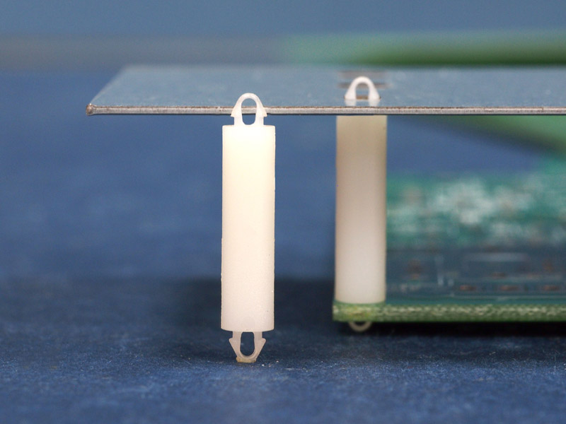 Dual locking support post. Snap lock teardrop design allows fixation into small holes. Top and bottom hole 2.5 mm. Standoff height 18 mm.