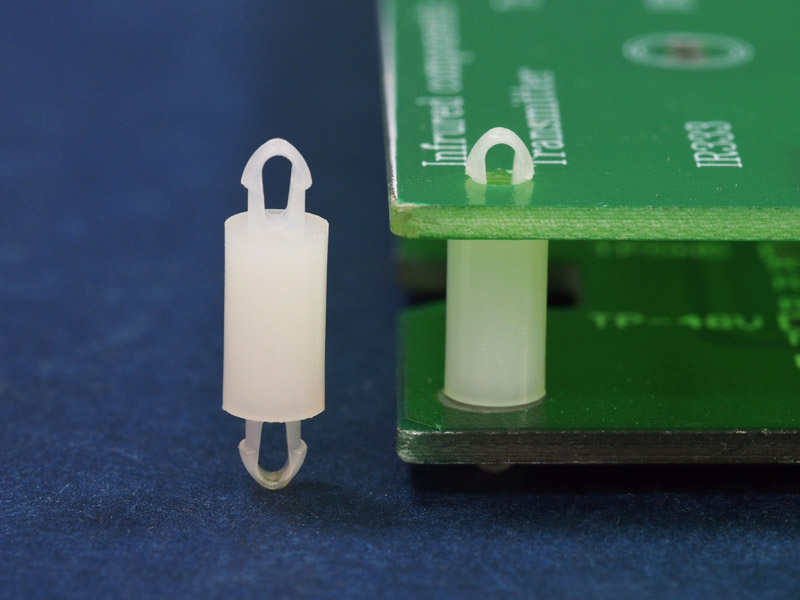 Dual locking support post. Snap lock teardrop design allows fixation into small holes. Top and bottom hole 2.5 mm. Standoff height 3 mm.