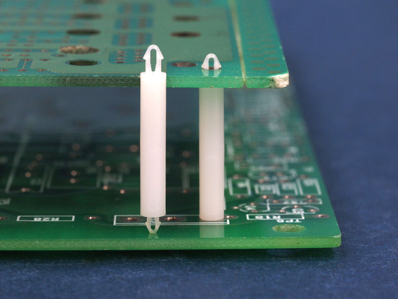 Dual locking support post. Snap lock teardrop design allows fixation into small holes. Top hole 1.6 mm. Bottom hole 2 mm. Length 19.2 mm.