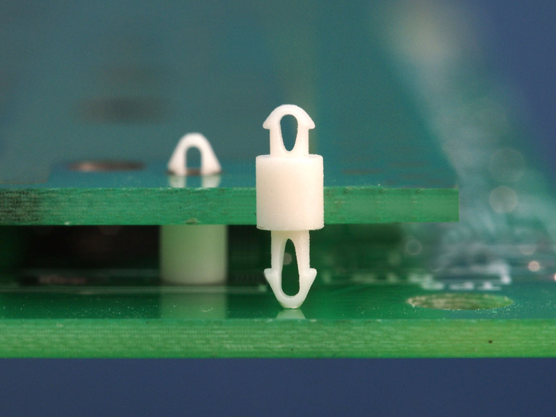 Dual locking support post. Snap lock teardrop design allows fixation into small holes. Top hole 1.6 mm. Bottom hole 1.6 mm. Length 3 mm.