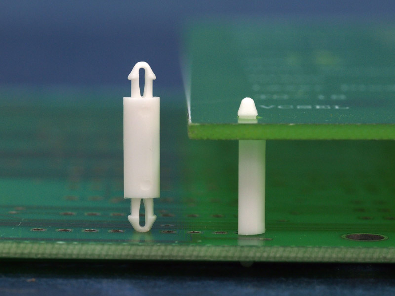 Dual locking support post. Snap lock teardrop design allows fixation into small holes. Top hole 2 mm. Bottom hole 2 mm. Length 9.5 mm.