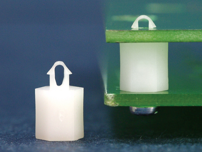 Snap lock hexagonal self tapping spacer with a pilot hole of 1.7 mm and an arrowhead for a 2.5 mm mounting hole. Spacer length 6.5 mm.