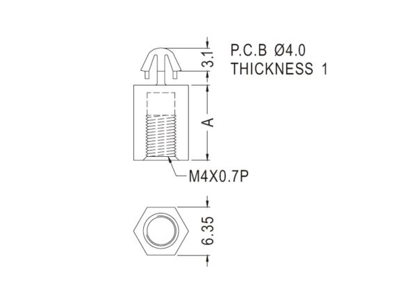 Snap lock hexagonal M4 spacer provided with an arrowhead for a 4 mm mounting hole. Spacer length 15.9 mm.