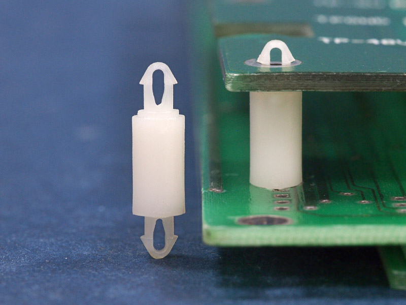 Dual locking support post. Snap lock teardrop design allows fixation into small holes. Top and bottom hole 2.5 mm. Standoff height 9 mm.