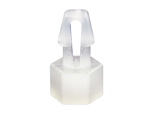 Push spacer hexagonal rest support provided with a snap lock for a 1.5 mm mounting hole. Standoff height 0.8 mm.
