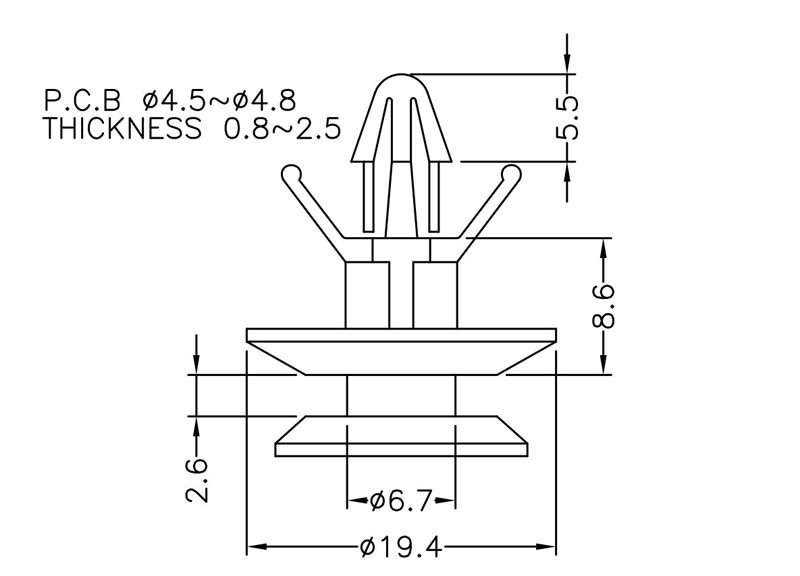 Snap lock winged arrowhead for a 4.5~4.8 mm panel hole and a key slot locking at the chassis side. Spacer length is 8.6 mm.