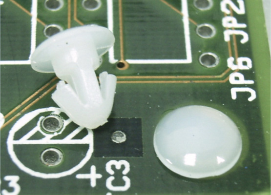Snap Lock Rivet. Material Nylon 66. Mounting hole dia Ø 3.0mm. Panel Thickness 3.5mm. Color Natural/Black. This Mounting Button has a locking arrowhead which can be released from the PCB underside