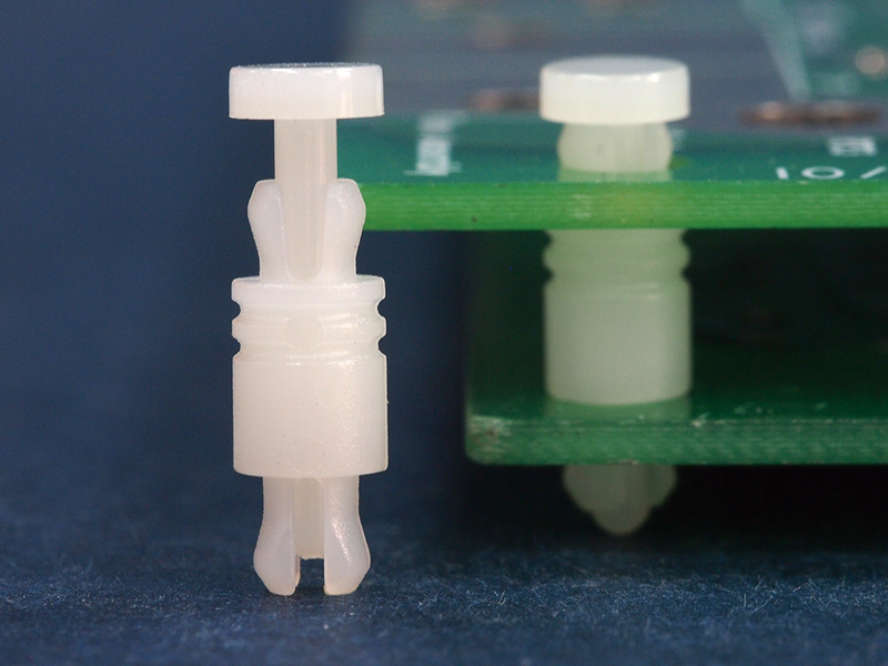 PCB support for 3.2 mm top and bottom panel hole. Firmly secured with removable locking pin (included). Standoff height 6.4 mm.