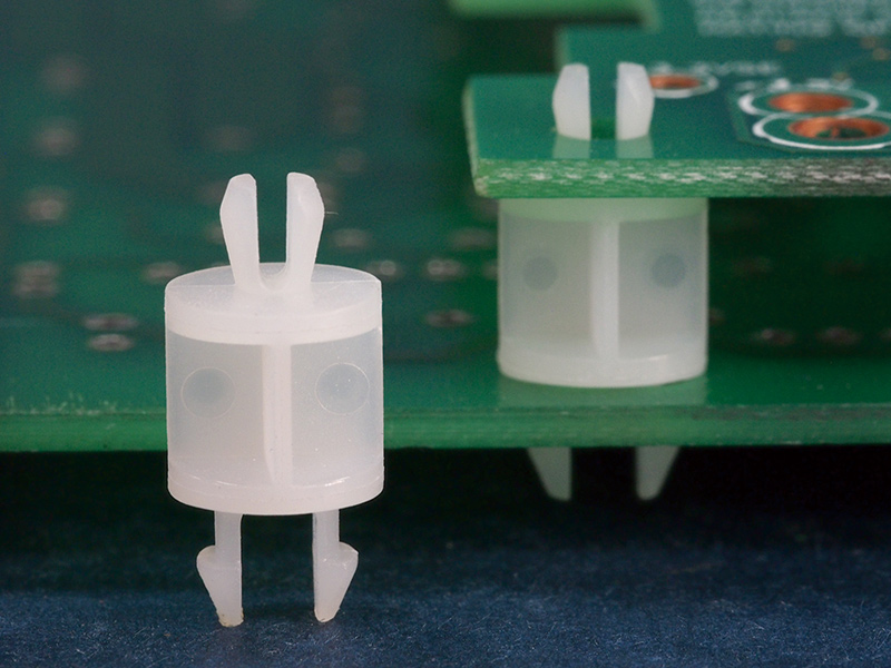 Dual snap lock support. Fits a top hole of 3.3 mm with a two prong snap fit and a 4.8 by 3.2 mm bottom hole with a two prong snap lock. Standoff height is 7.9 mm.