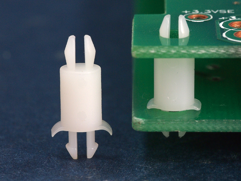 Dual snap lock support. Fits a top hole of 3.3 mm with a two prong snap fit and a 4.8 by 3.2 mm bottom hole with a two prong snap lock. Standoff height is 12 mm.