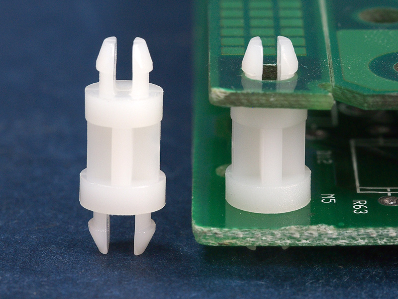 This spacer fits a panel top hole of 4 mm and a bottom hole of 4.8 mm with a two prong snap lock. Standoff height is 12.7 mm.