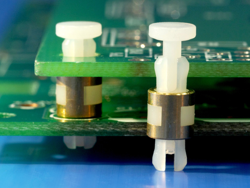 PCB support for 3.2 mm top and bottom panel hole. Firmly secured with removable locking pin (included). Standoff height is 5 mm.