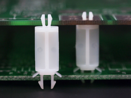 Dual snap lock support. Fits a top hole of 3.3 mm with a two prong snap fit and a 4.8 by 3.2 mm bottom hole with a two prong snap lock. Standoff height is 12 mm.
