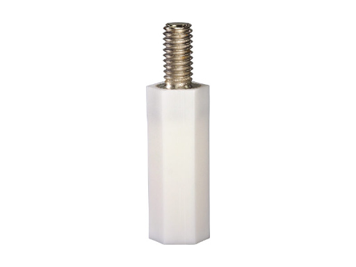 Hexagonal M4 Female/Male nylon spacer with metal threaded inserts for higher mechanical retention. Spacer body length is 57 mm.