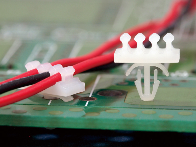 Snap-Lock Wire Mount 3-way. Holding dia. Ø1.4mm. Mounting Hole dia.Ø 2.5mm. Panel Thickness 1.6mm. Base Dimensions (LxW) 9.0×4.5mm. Nylon 66. Available in Natural or Black.