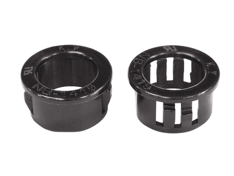 Nylon 66 Insulated Snap Bushing. Chassis Hole dia. Ø38.0mm. Panel Thickness 1.0-3.1mm. These Snap Bushings protect wires, cables, and tubing from sharp or uneven edges. UL recognized.