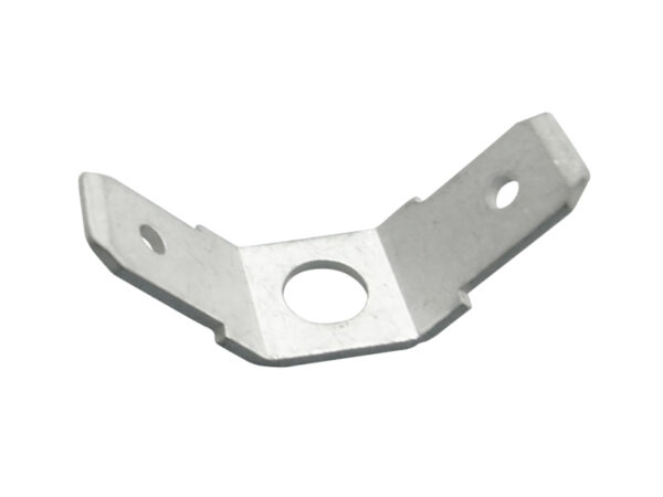Stud Hole Angled Dual Spade Terminal. Tin Plated Brass. Through Hole Screw Mount Ø4.3mm. Tab size 6.35×0.8mm (.250″). 45 degree Bend Radius